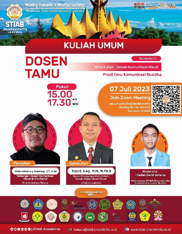 Hari Jumat, 07 Juli 2023, Pukul 15.00-17.30 WIB, Semester II Program Studi Ilmu Komunikasi Buddha : Mata kuliah " Desain Komunikasi Visual " dengan narumber Viktor Adiluhung Abednego, S.T., M.Ds. dari Bina Nusantara Malang.